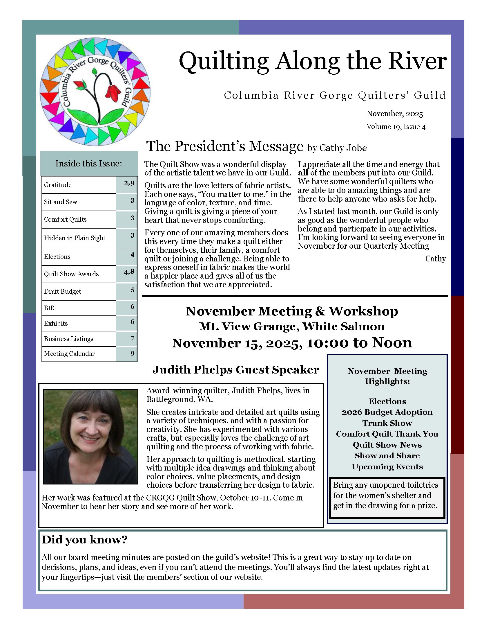 An archive of our newsletter “Quilting Along the River” from 2016 forward.